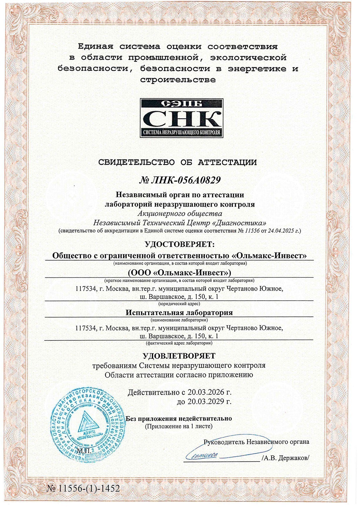 Свидетельство об аттестации № ЛНК-056А0829 от 20 марта 2026 года